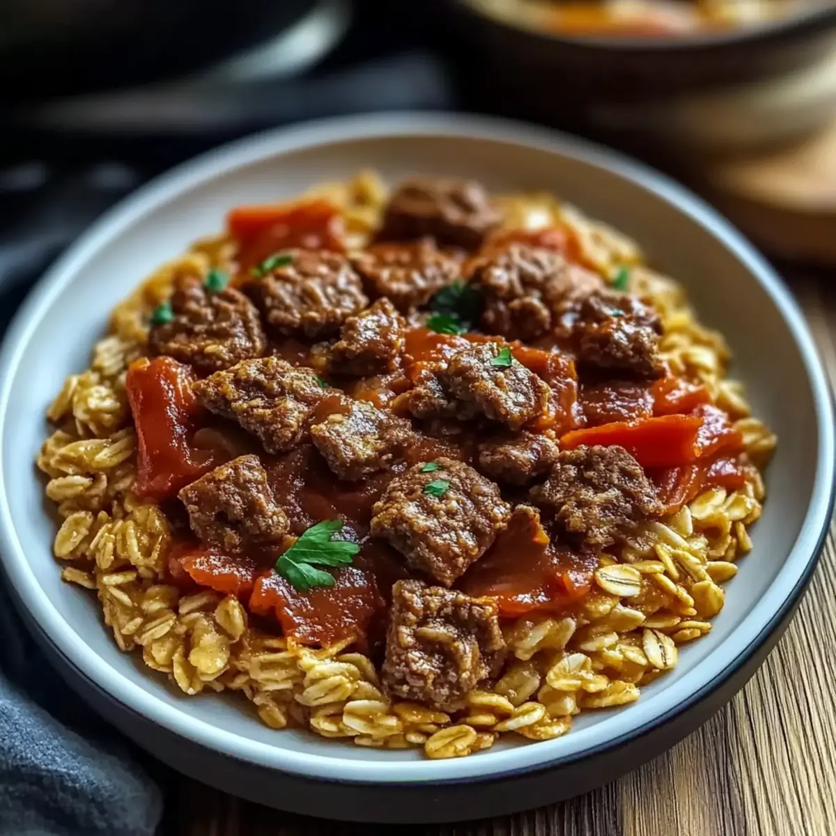 - Stir in dried oregano and basil, followed by diced tomatoes and beef broth.