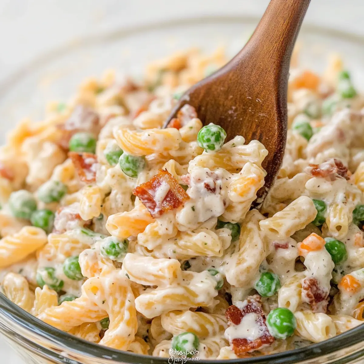 - In a large mixing bowl, add the cooked pasta, cooled ranch dressing, and the crumbled bacon. Toss gently to coat everything evenly, ensuring that every piece of pasta is engulfed in that creamy dressing. Next, fold in the frozen green peas and shredded cheddar cheese, incorporating them gently to maintain the pasta's integrity while adding a burst of flavor and color to your Bacon Ranch Pasta Salad.