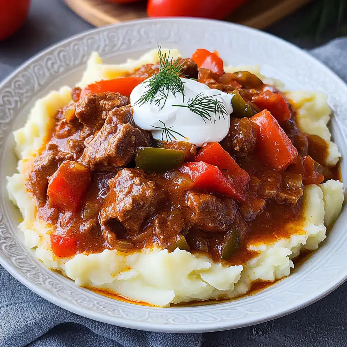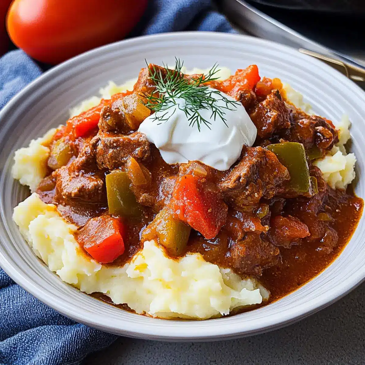 Once your Beef Paprikash is cooked to perfection, ladle it over a bed of soft egg noodles, creamy mashed potatoes, or serve it alone for a rich experience. Finish with a generous dollop of sour cream and a sprinkle of fresh dill or parsley for a burst of color and flavor. Enjoy your heartwarming meal!