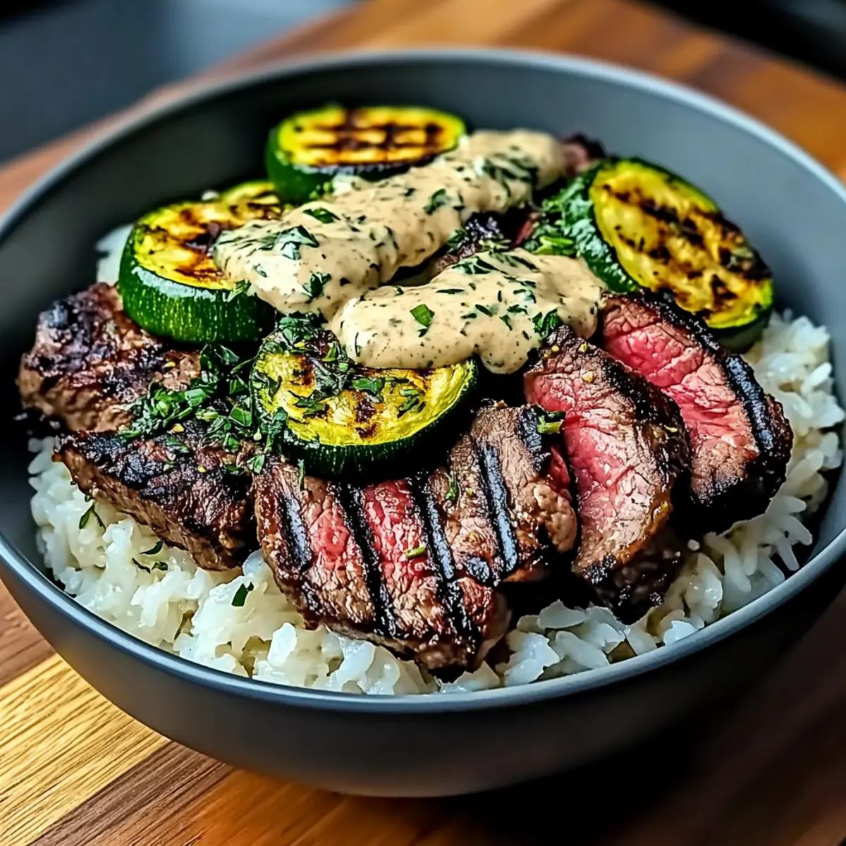 Grilled Steak Bowl with Sauce & Grilled Zucchini Bliss to Love