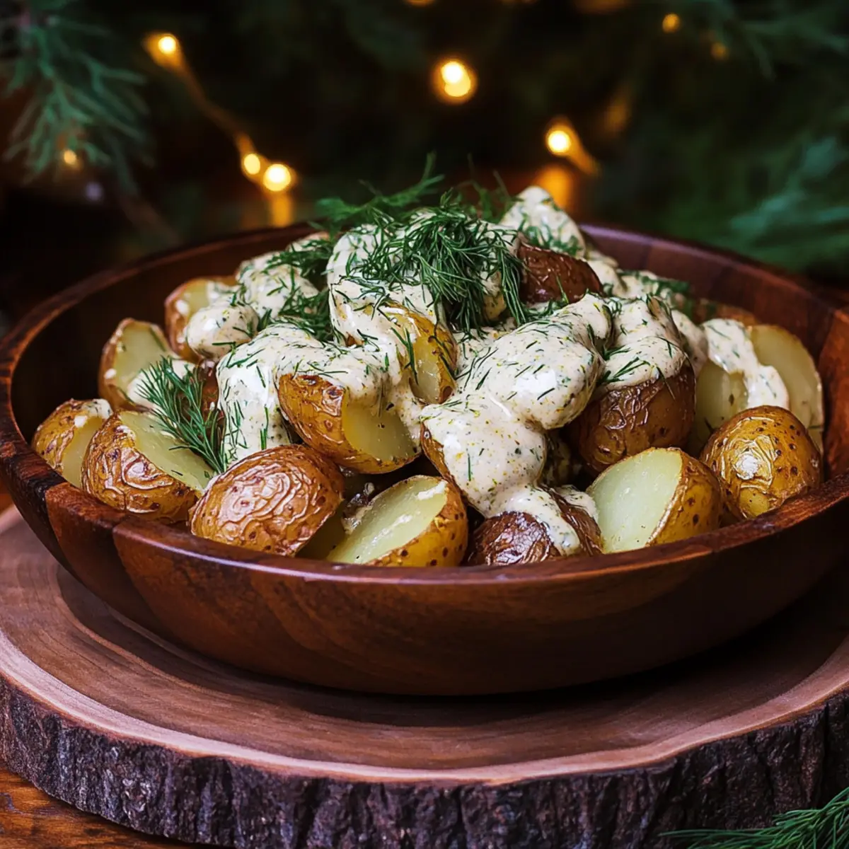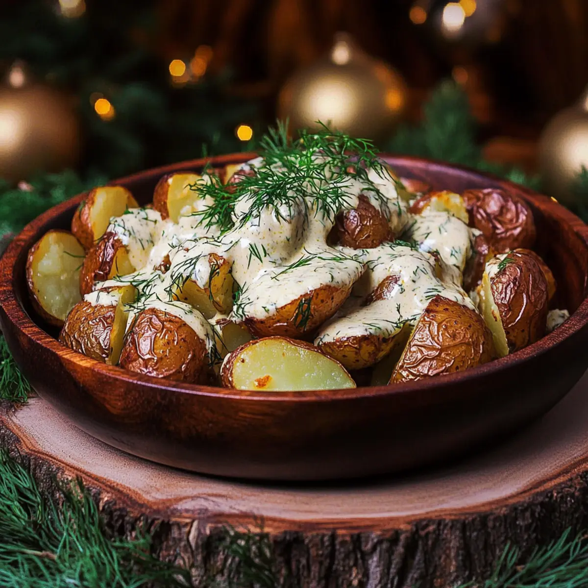 - Add a splash of lemon juice to the sauce, adjusting seasoning as necessary. Layer the roasted potatoes in a serving bowl and drizzle with the creamy mustard sauce. Garnish with chopped dill.