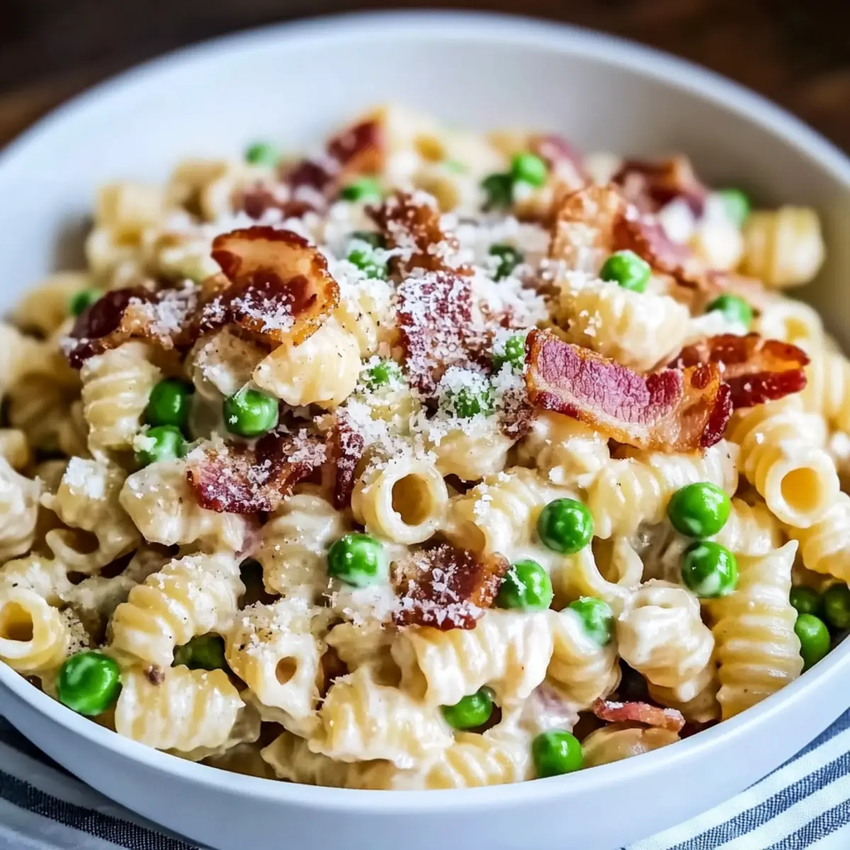 - In a large mixing bowl, combine the cooled pasta with 2 cups of thawed frozen peas and add 12 ounces of chopped thick-cut bacon. Stir in 1/2 cup of freshly grated Parmesan cheese, mixing until evenly distributed.