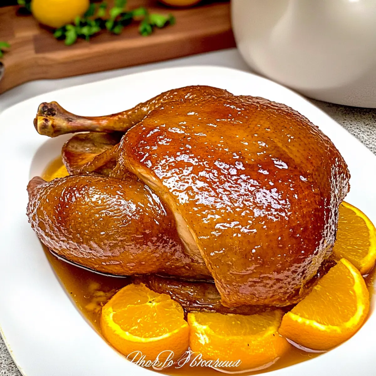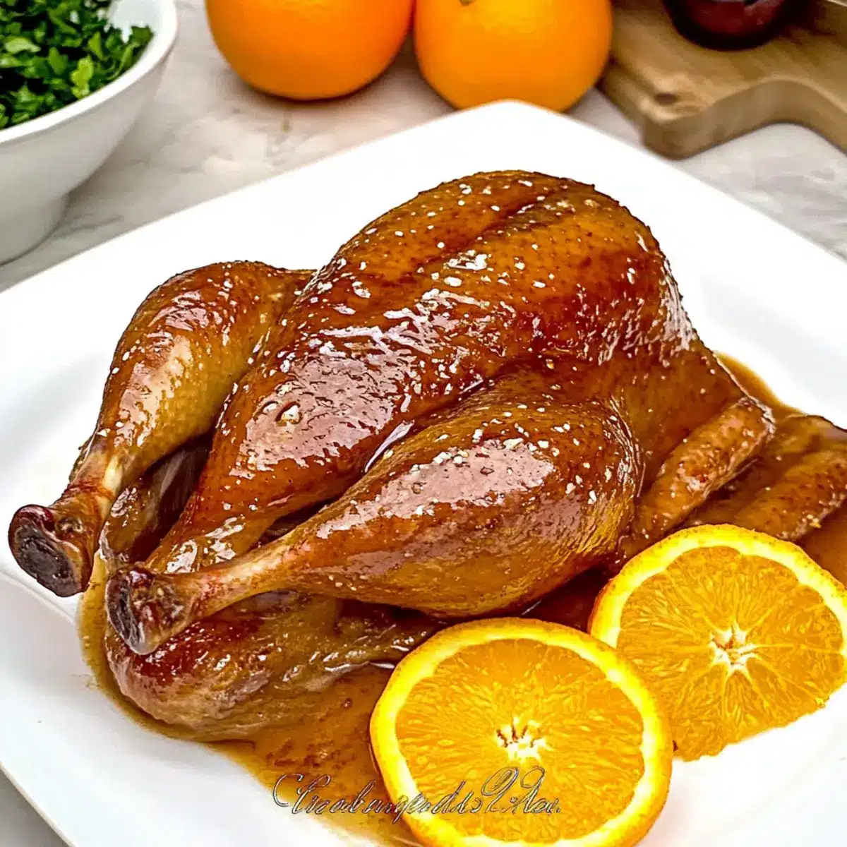 When the duck has rested, brush it generously with the prepared orange sauce. Cut the duck into quarters and arrange it on a serving platter. Drizzle some additional sauce over the top for that extra touch of flavor, and get ready to impress your guests with your exquisite Duck with Orange Sauce!