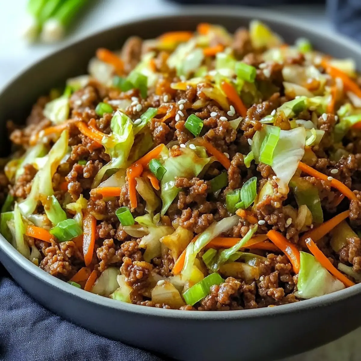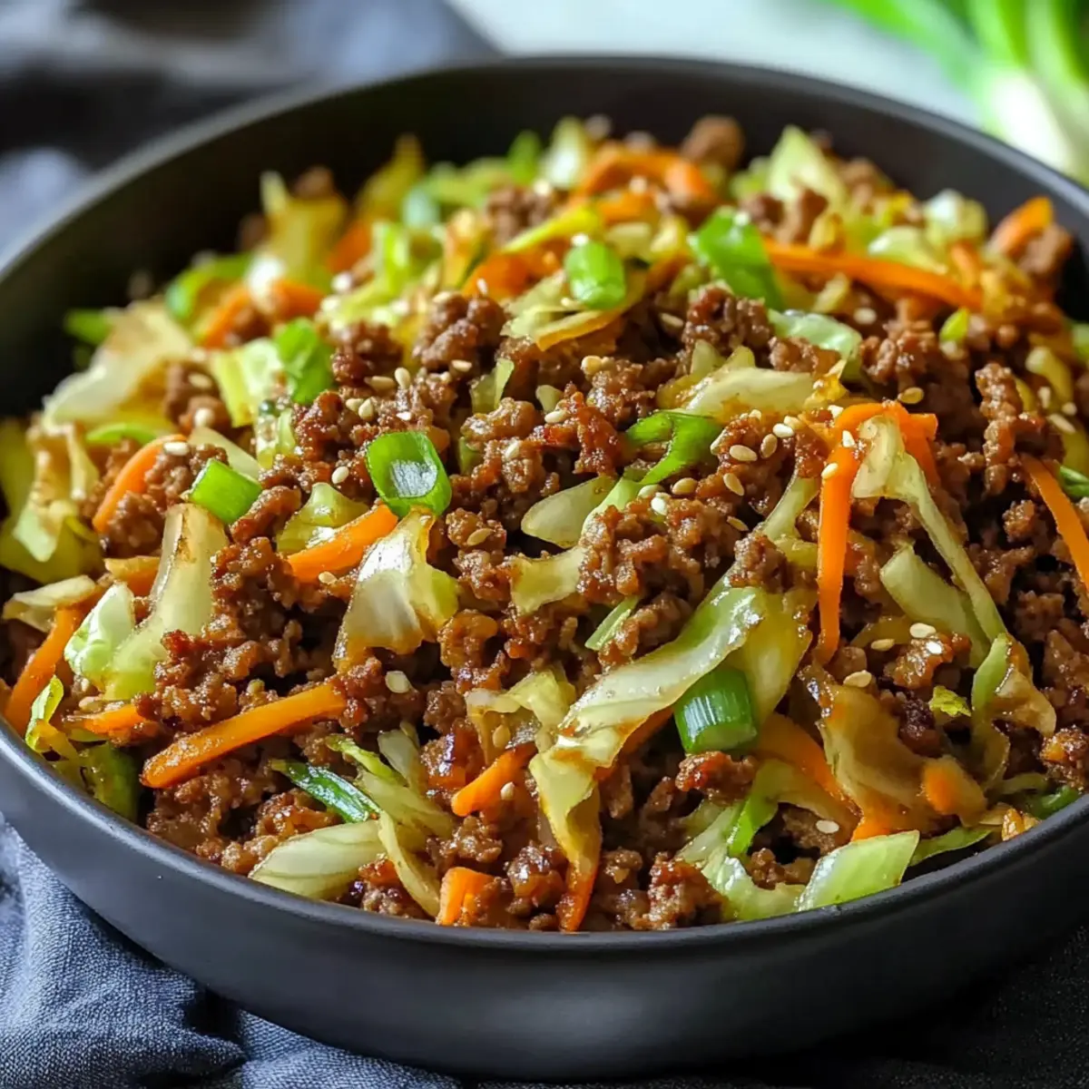 Remove the skillet from heat and give it a final toss. Garnish your Egg Roll in a Bowl with chopped green onions and sesame seeds for added freshness and crunch if desired. Serve warm, and enjoy the vibrant flavors of this healthy dish!