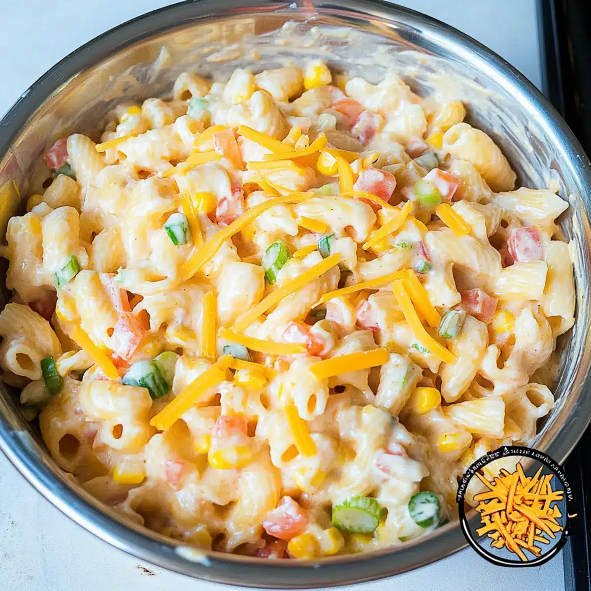 Now, lovingly fold in the shredded cheddar cheese to the vegetable mixture, ensuring it’s evenly distributed. Then, gently incorporate the cooled pasta, mixing carefully until all ingredients are harmoniously blended. This step not only enhances the creaminess but adds a comforting richness to the Fiesta Corn Pasta Salad.