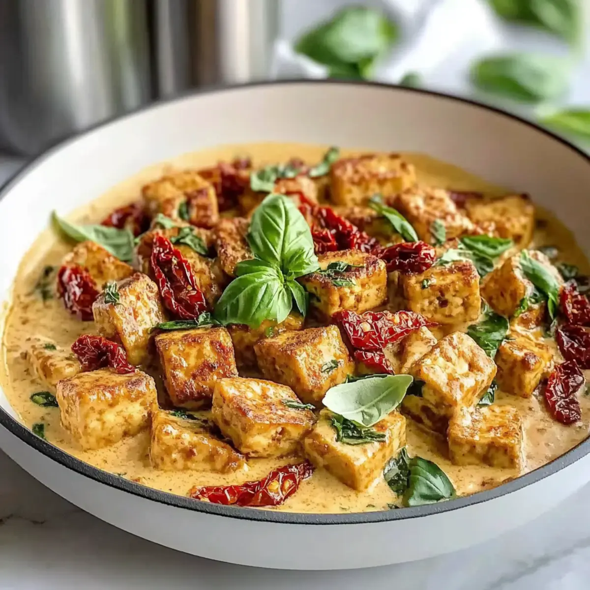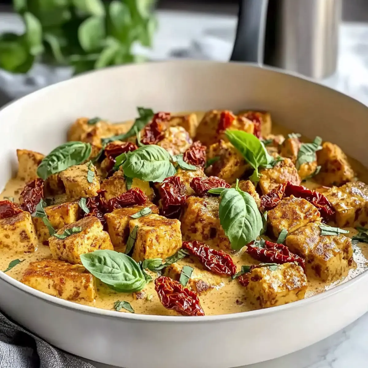 - Add the crispy tofu and sun-dried tomatoes into the creamy sauce, stirring to coat. Let it simmer for another 2-3 minutes, ensuring the tofu absorbs the sauce.
