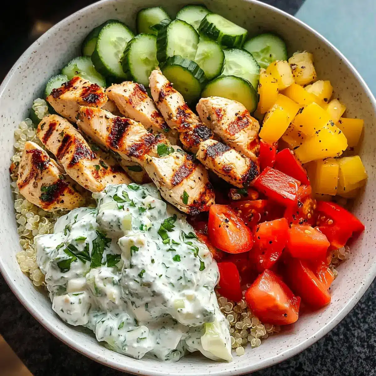 - Assemble bowls with rice or quinoa, fresh vegetables, sliced chicken, and tzatziki sauce. Drizzle with olive oil and lemon juice before serving.