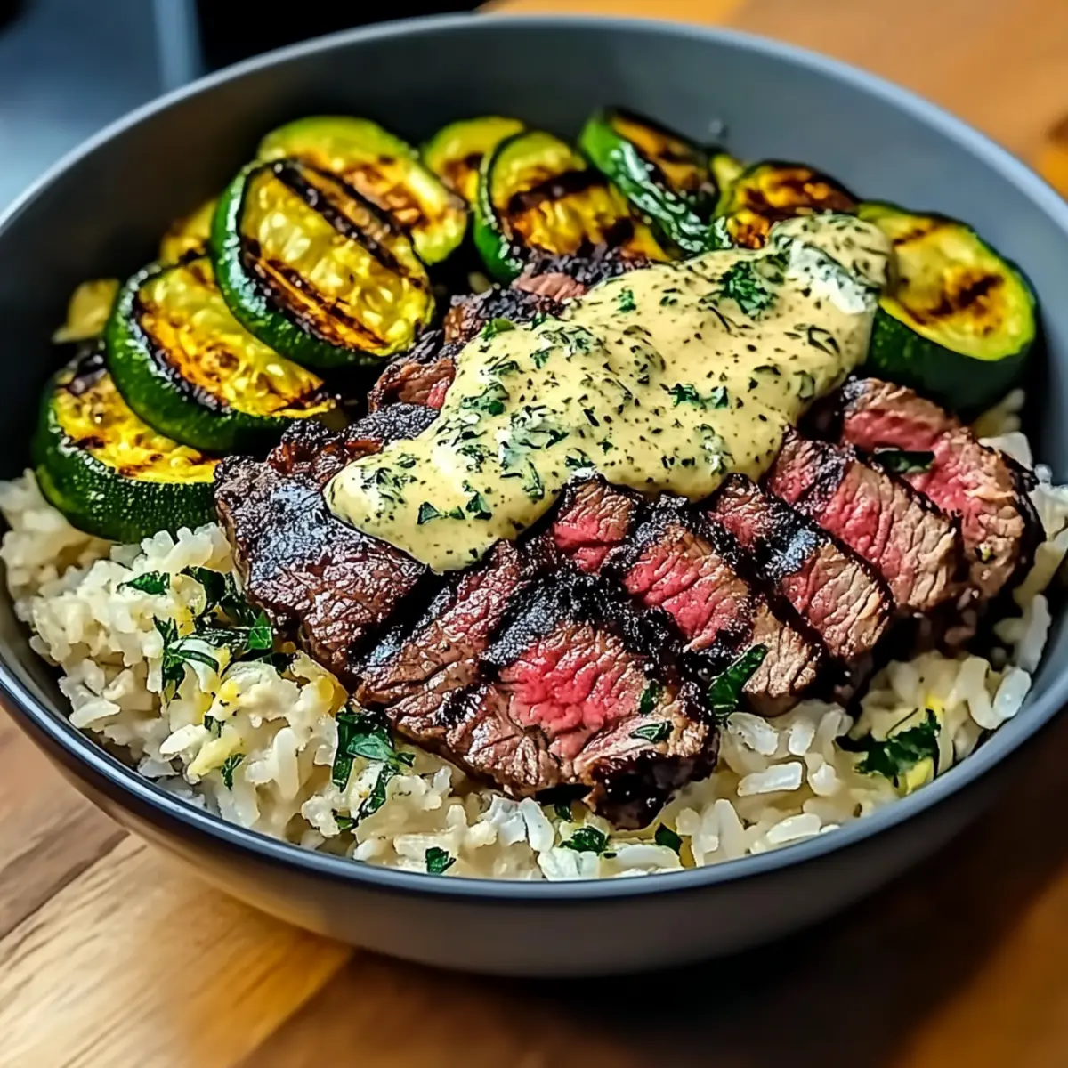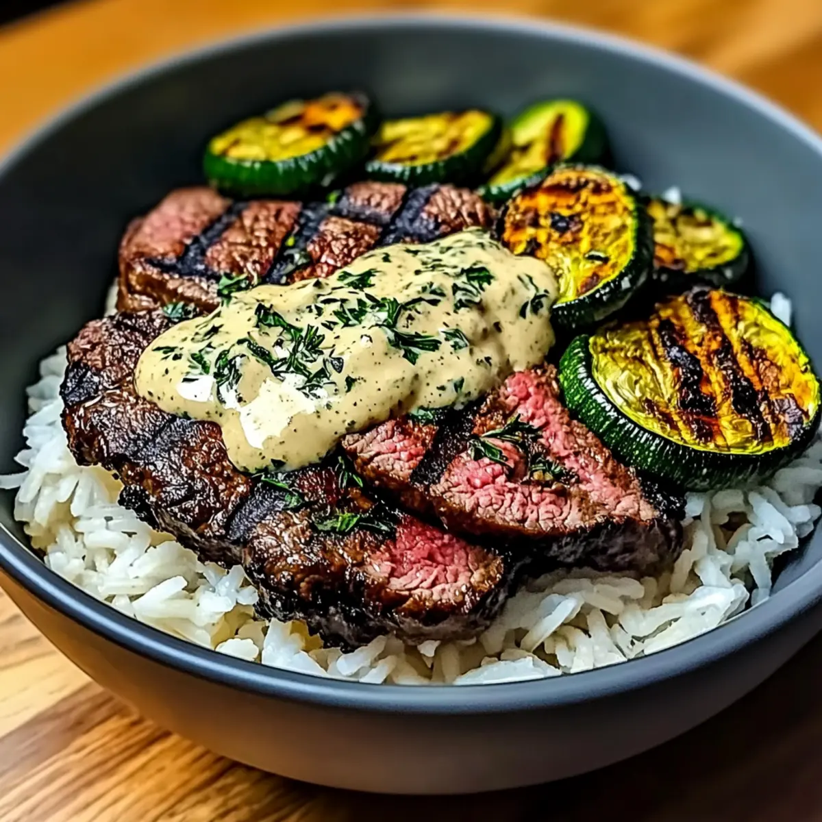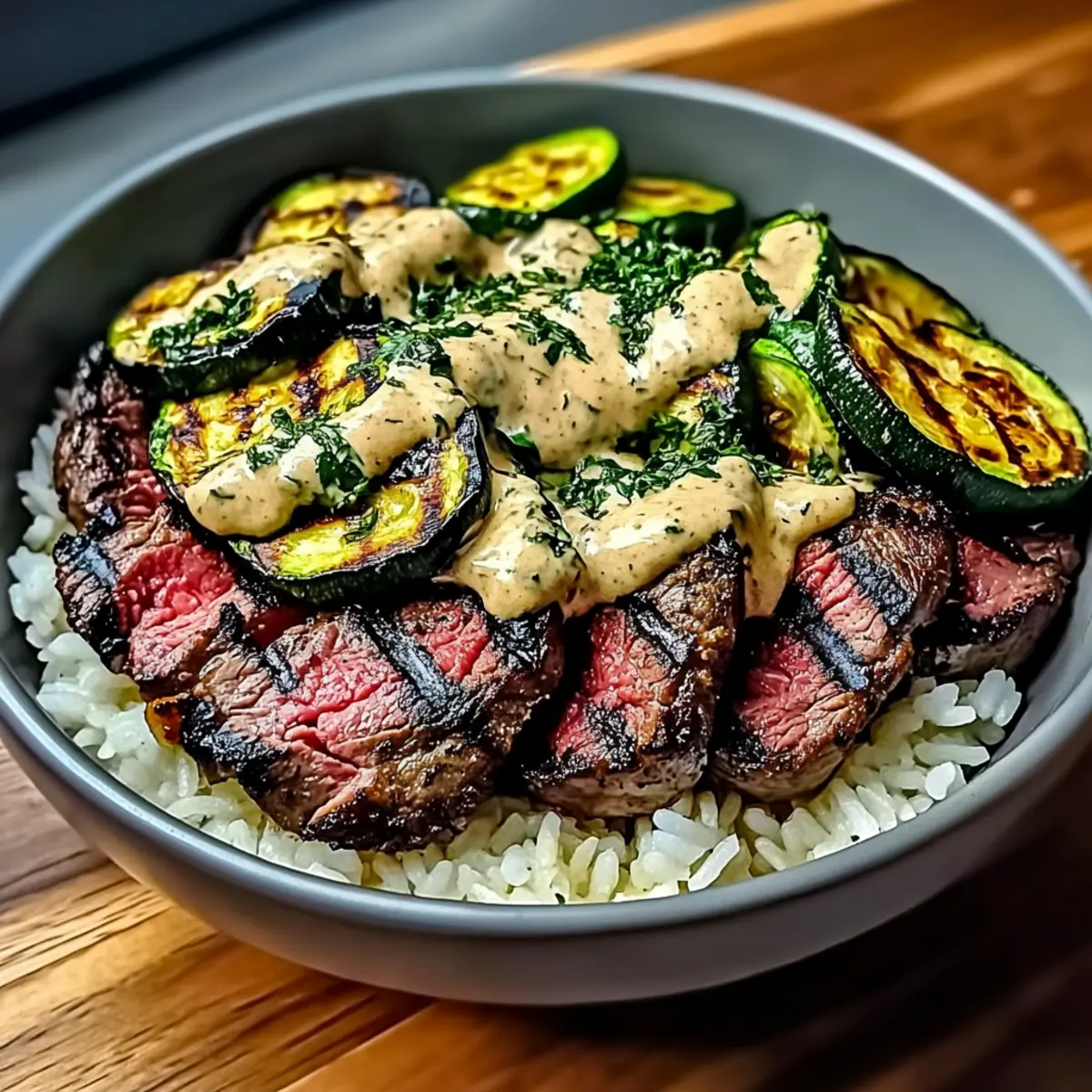 Start building your Grilled Steak Bowl by placing a generous layer of cooked rice or creamy mashed potatoes at the bottom of a bowl. Next, arrange the grilled zucchini on top, followed by slicing the rested steak against the grain into thin strips to showcase its tenderness. Finally, drizzle the creamy herb sauce over the top for that irresistible finishing touch.