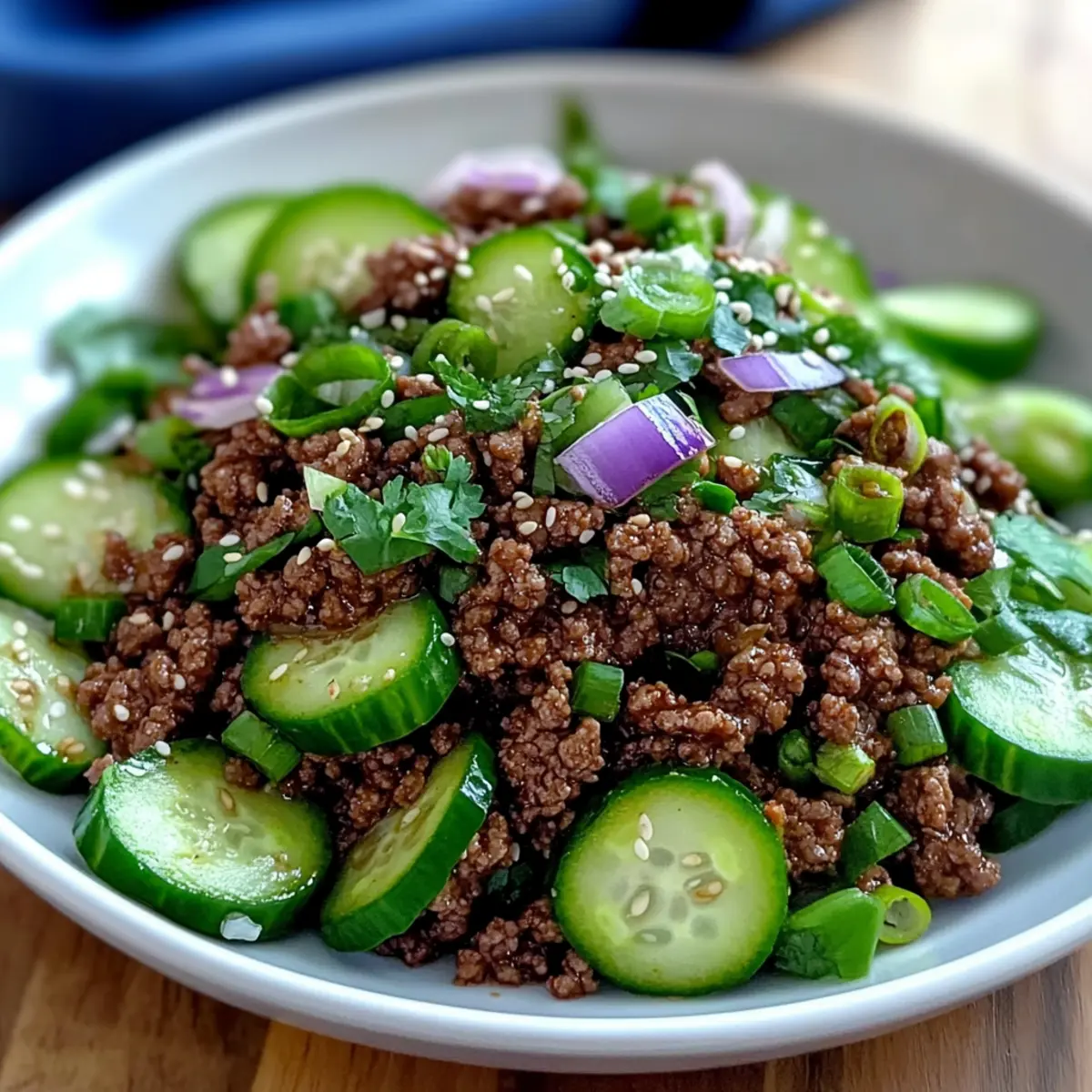To serve your Spicy Ground Beef with Cucumber Salad, scoop the beautifully seasoned beef onto plates. Top each serving with a generous helping of the cucumber salad. For an extra touch, sprinkle sesame seeds and chopped green onions over the top to add texture and vibrancy, making the dish visually appealing and delicious.