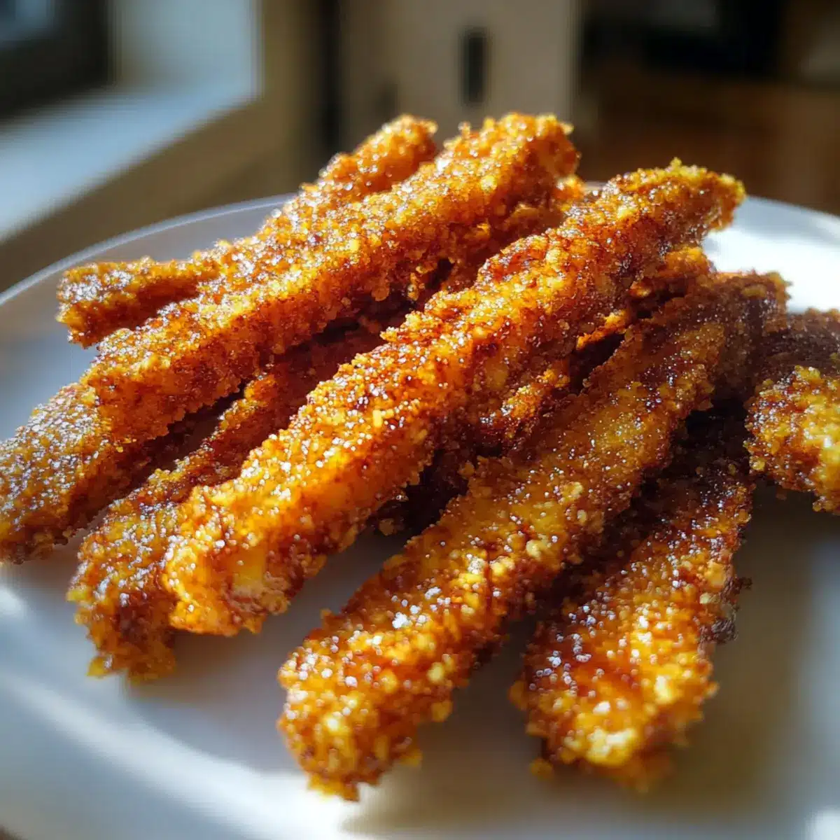 Take each tofu strip and dip it into the honey mustard mixture, making sure they’re well-coated. Roll each strip in a blend of breadcrumbs mixed with garlic powder and paprika, ensuring full coverage. The breadcrumbs will create that satisfying crunch that complements the tender tofu beautifully.