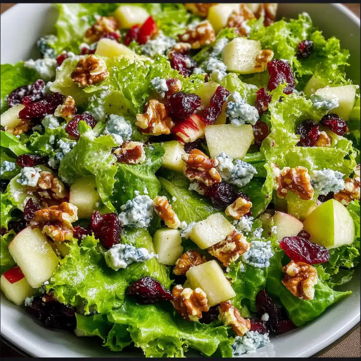 - In a large mixing bowl, combine the greens, apple pieces, dried cranberries, and toasted walnuts or pecans.