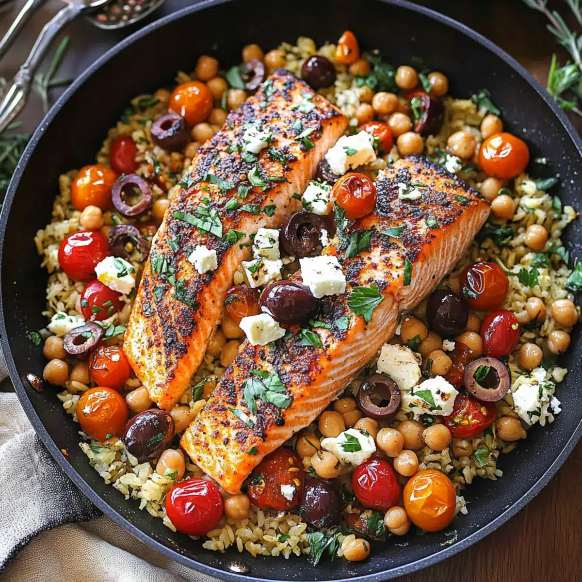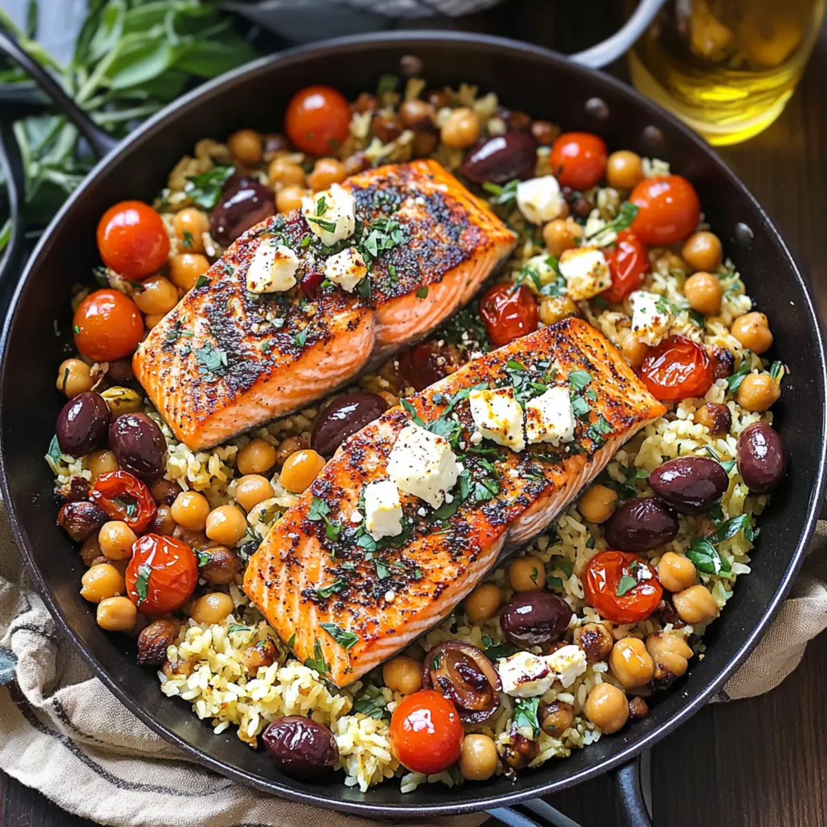 Preparing Mediterranean Salmon ahead of time is a fantastic way to save precious minutes on busy weeknights! You can prepare the rice mixture (including chickpeas, tomatoes, and olives) up to 24 hours in advance. Simply combine them in an airtight container and refrigerate. To maintain quality, do not mix in the feta until you’re ready to cook, as it can become mushy. Additionally, you can season and marinate the salmon fillets ahead of time, letting them sit in the fridge to absorb flavors. When it’s dinner time, just heat the rice mixture in a skillet, cook the salmon for about 9 minutes, and finish with the feta for a dish that’s just as delectable as if you made it fresh!