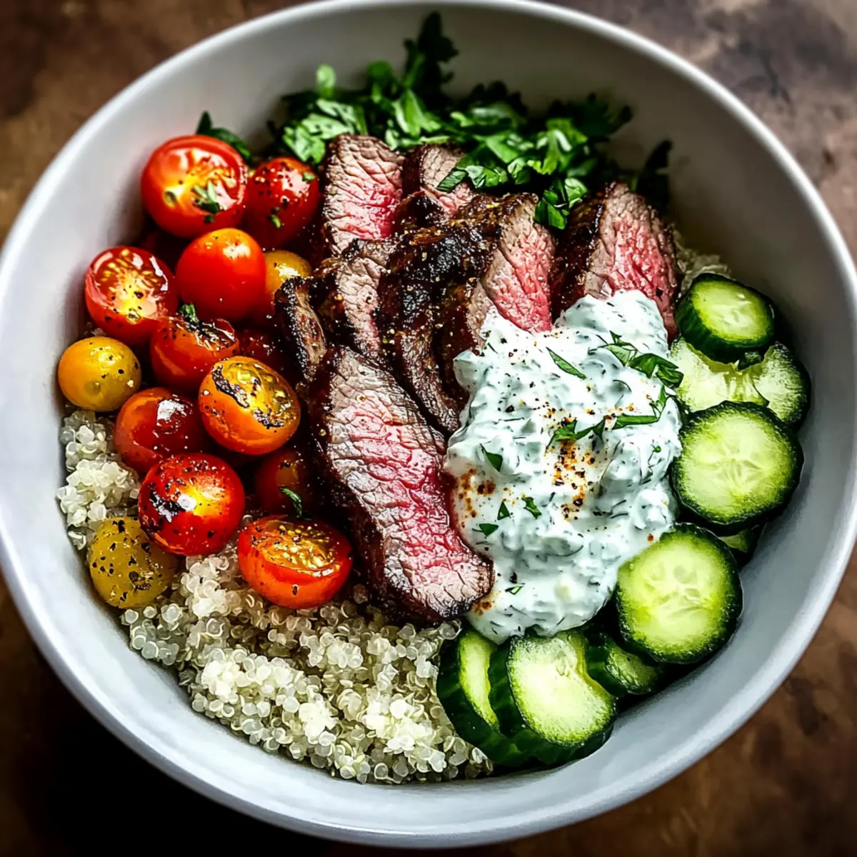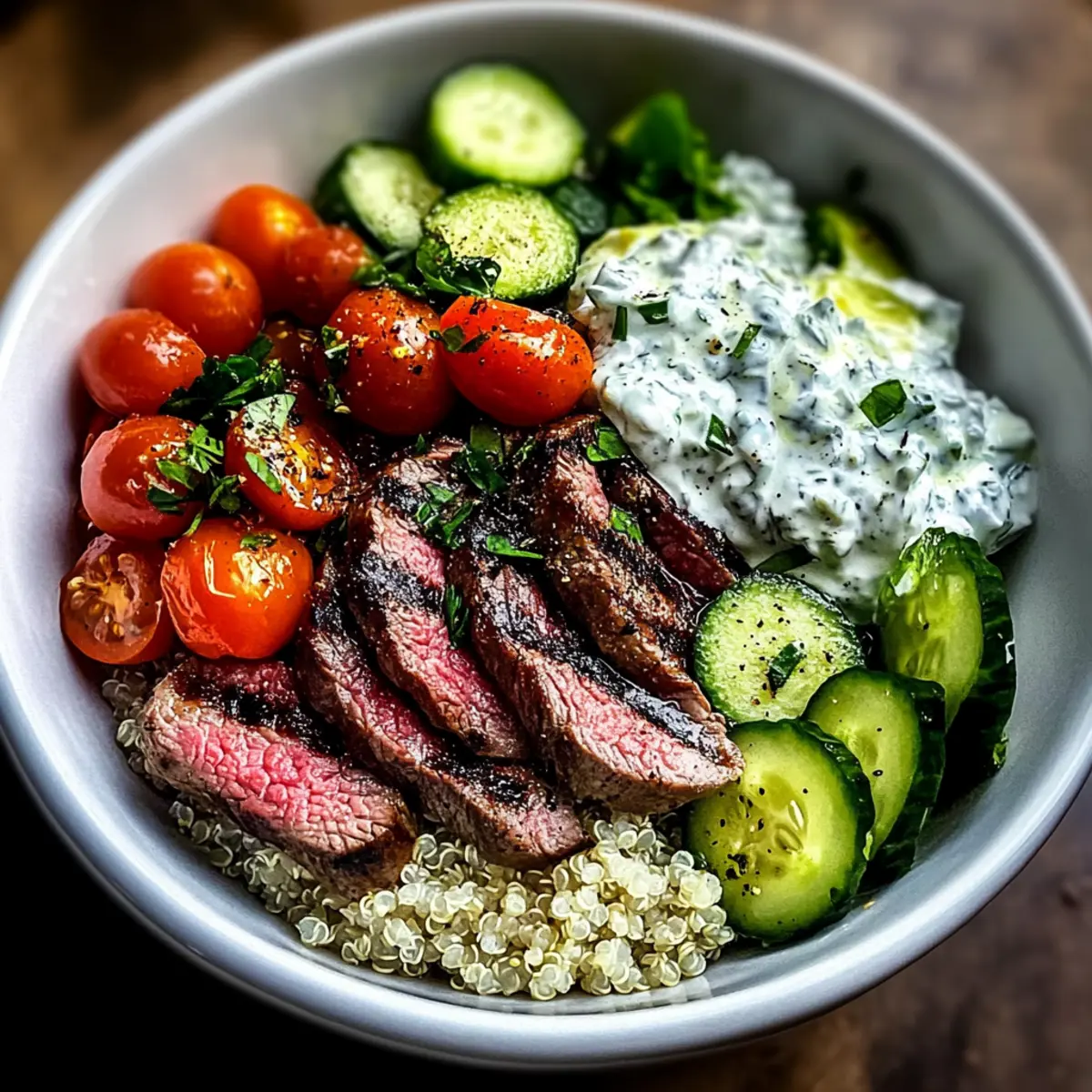 - Assemble the bowl with a base of cooked grains, sliced steak, fresh vegetables, olives, and feta cheese. Drizzle with tzatziki and serve.