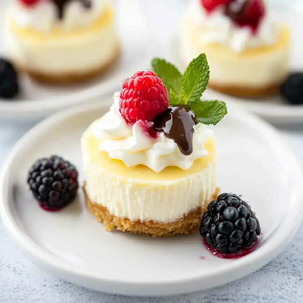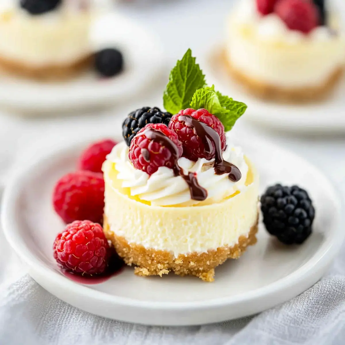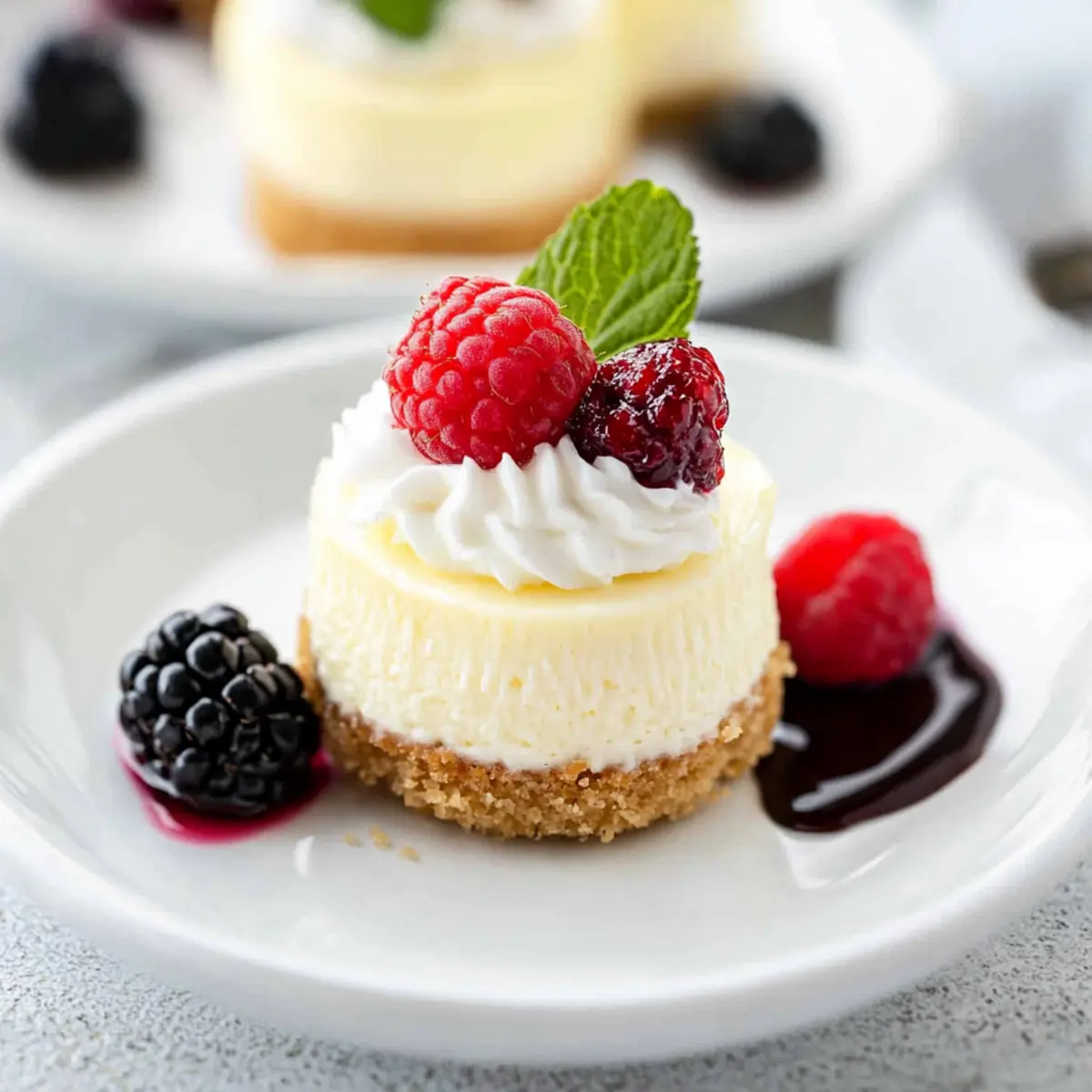 Whipped Cream: A fluffy dollop creates a delightful contrast to the creamy texture of the mini cheesecakes, making each mouthful feel indulgent and festive.
