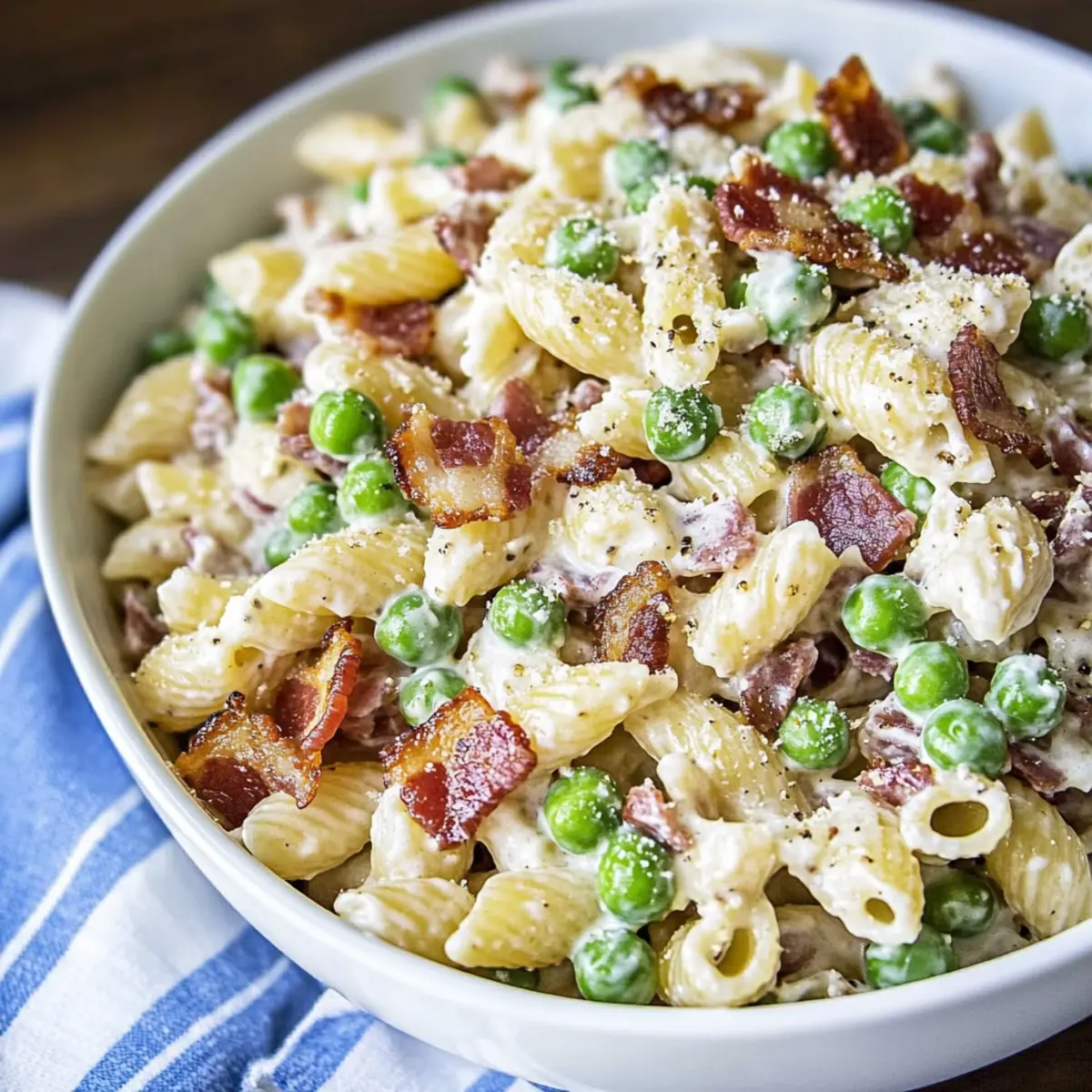 These creamy pasta salad preparations are perfect for busy home cooks looking to save time during hectic weeks! You can prepare the pasta and chop the bacon up to 24 hours in advance; just store them separately in airtight containers. Additionally, you can whisk the dressing together a day ahead to allow the flavors to develop beautifully. For the best quality, keep the peas and cheese refrigerated and add them just before serving to maintain their freshness. When you’re ready to enjoy your creamy pasta salad, simply combine all the ingredients, chill for about 1-2 hours, and you’ll have a delightful dish that tastes just as delicious as if made fresh!