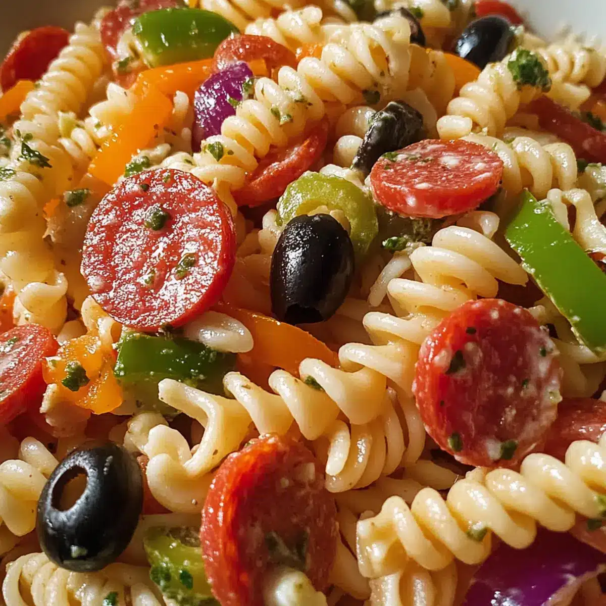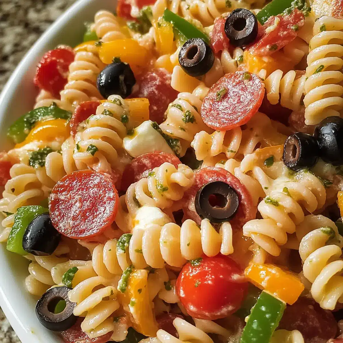Mix Gently: Stir carefully when combining ingredients to maintain the structure of the veggies and pasta; over-mixing may lead to mushy textures in your Pizza Pasta Salad.