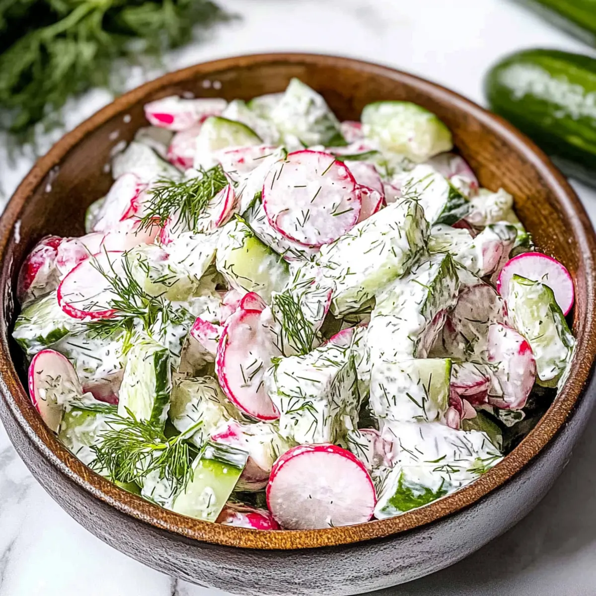 As summer approaches, I can’t help but crave refreshing dishes that match the season’s vibrancy. That’s when my Creamy Cucumber Radish Salad comes in, a delightful blend of crisp cucumbers and peppery radishes, all enveloped in a creamy Greek yogurt dressing. This radish salad isn’t just a feast for the eyes, but it also boasts remarkable benefits; it’s low-calorie and loaded with fiber, making it a guilt-free addition to any meal. Whether you’re looking to elevate your lunchtime fare or need a light side dish for your next gathering, this recipe effortlessly fits the bill. Plus, it’s super quick to whip up, so you’ll have more time to enjoy the sunshine. What unique twists do you plan to add to your own version?