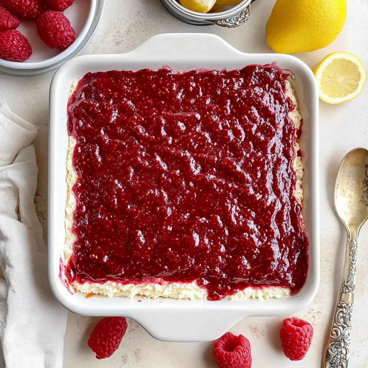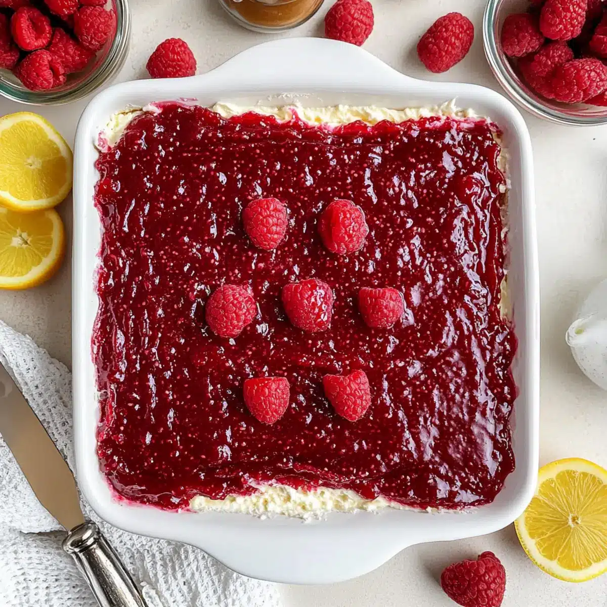 Once set, remove the tiramisu from the refrigerator and spread the remaining raspberry jam on top. Garnish with fresh raspberries and lemon slices for an added touch of vibrancy. Slice into squares and serve chilled, allowing your guests to indulge in every luscious bite of this refreshing Raspberry Tiramisu.