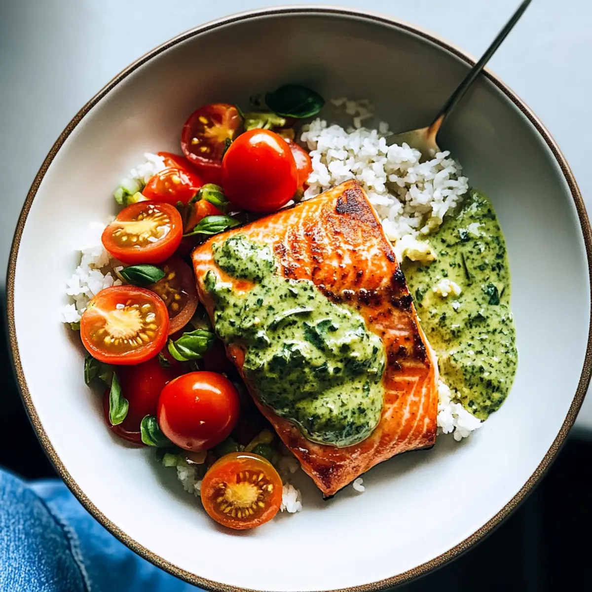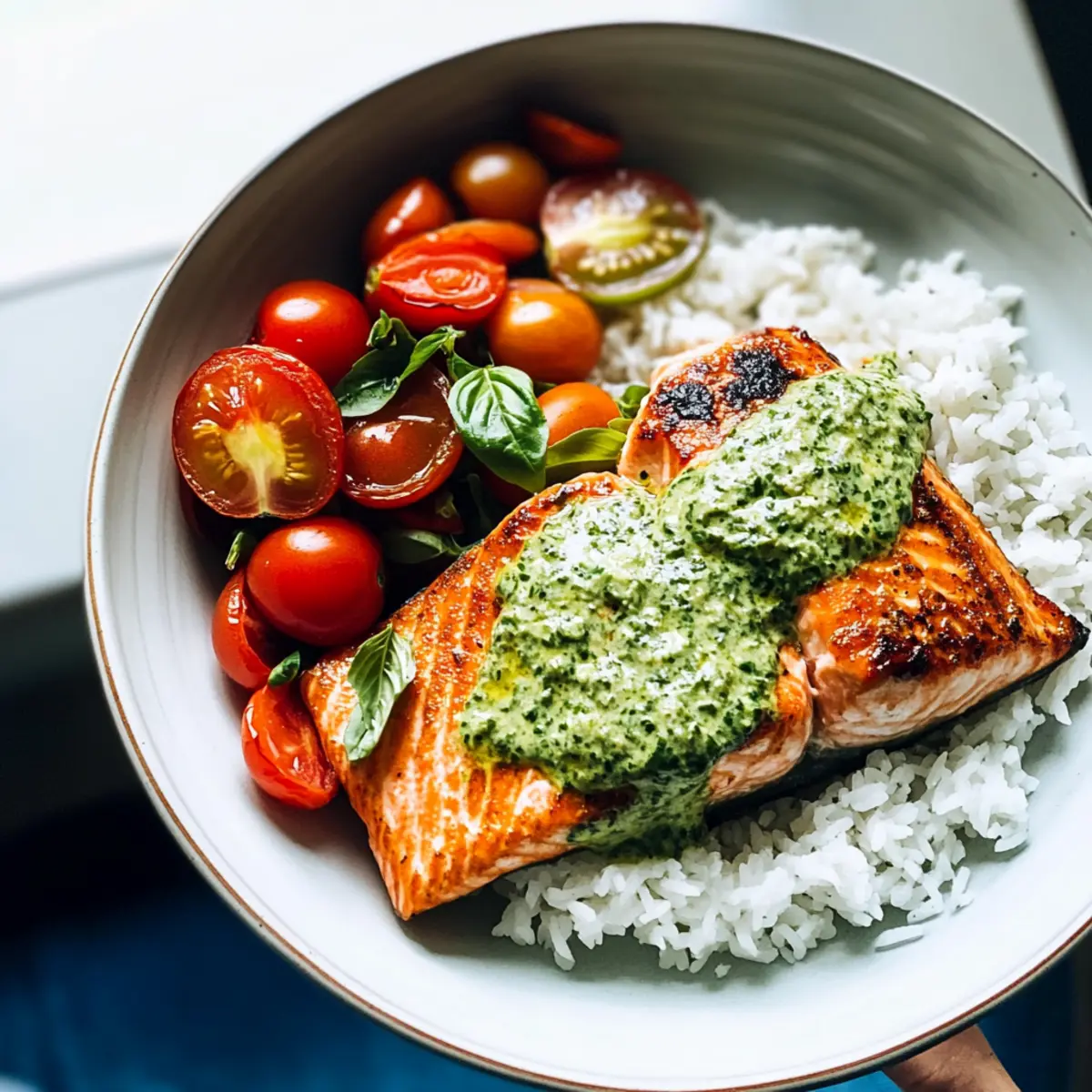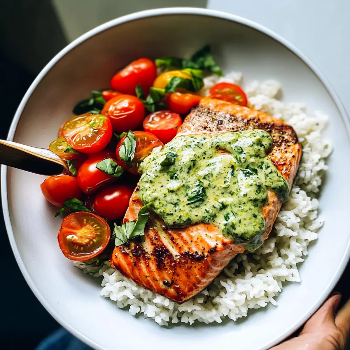 Grain Bowl Creation: Serve the salmon on a bed of quinoa or rice, topped with the basil sauce and a scoop of the tomato salad. It’s a filling, flavorful bowl of goodness!
