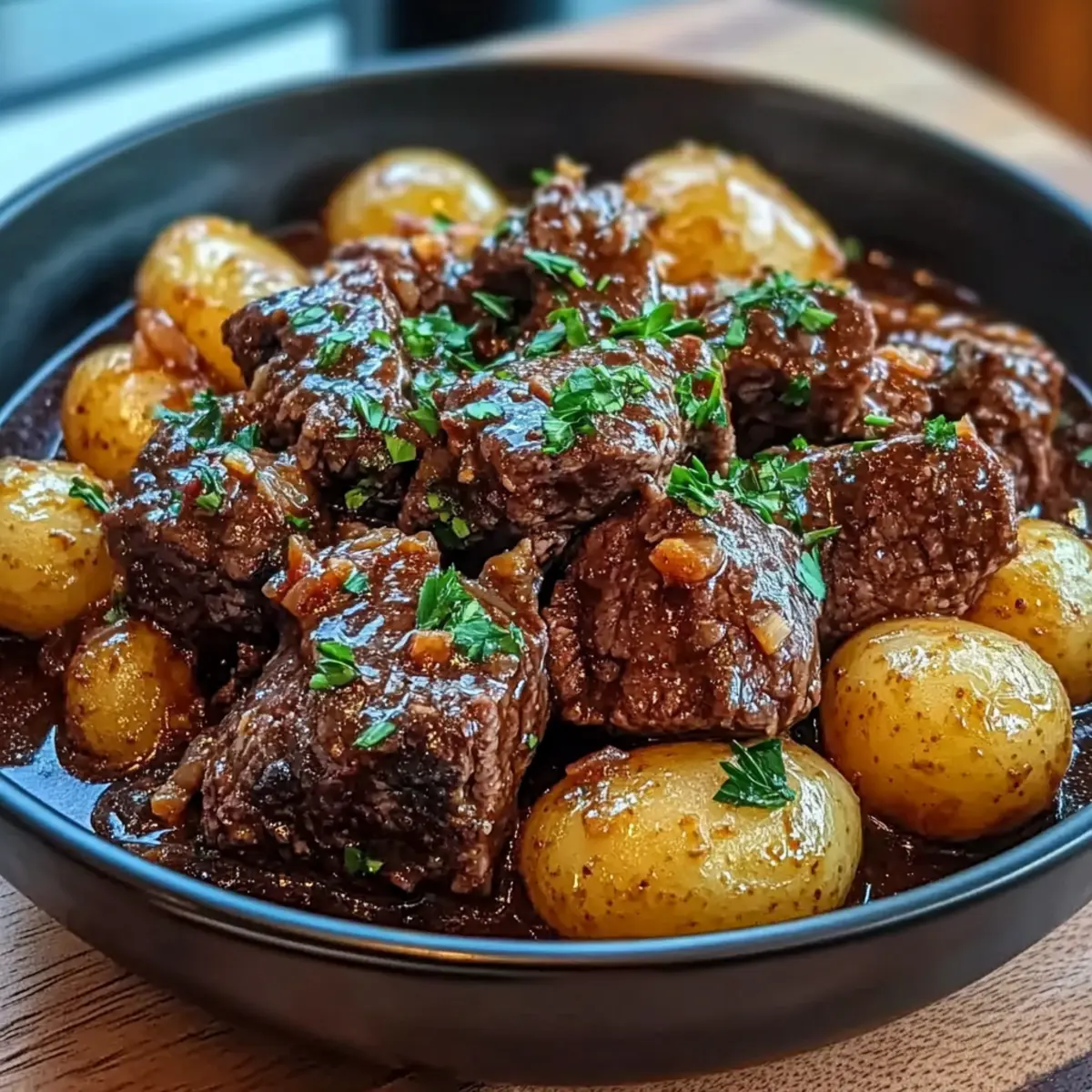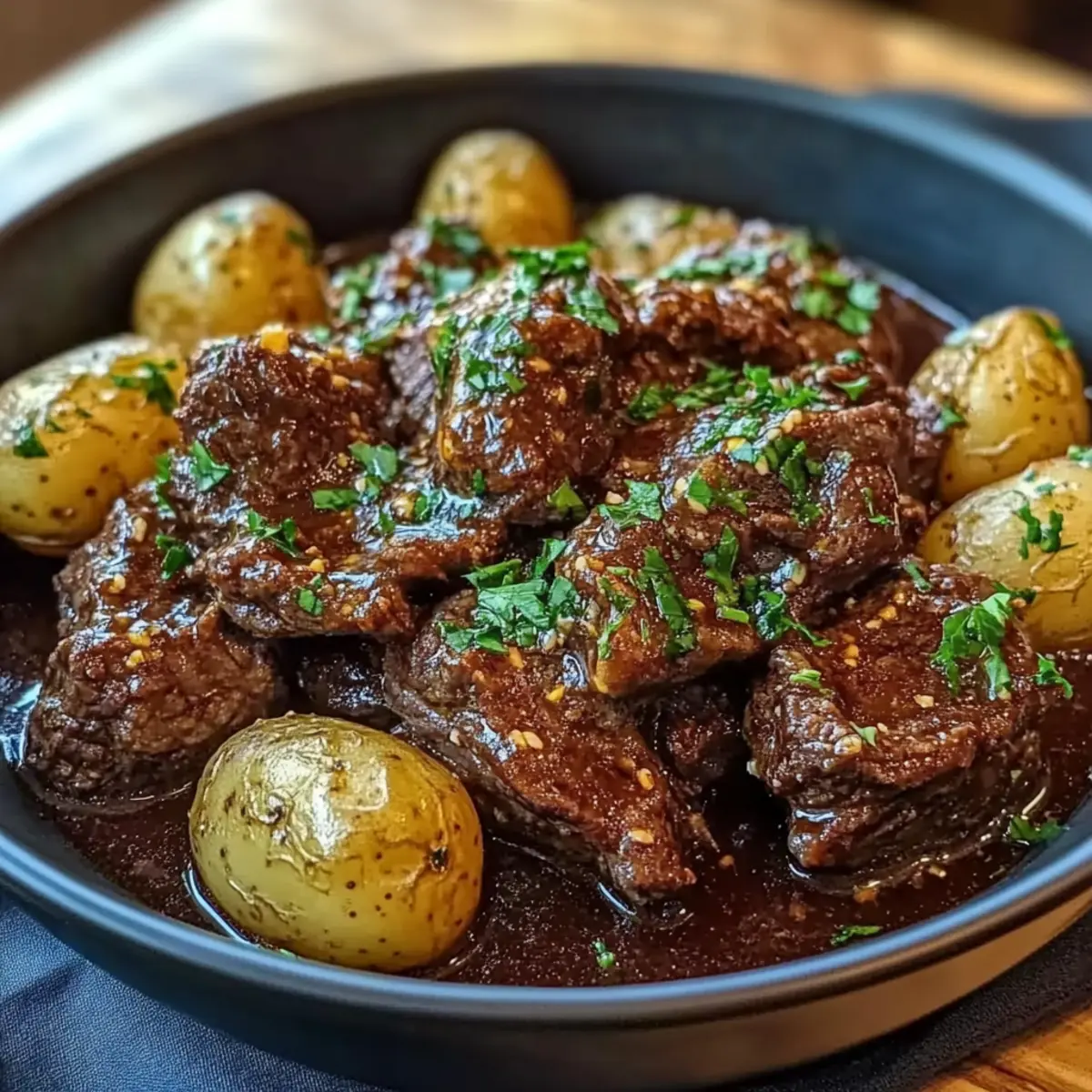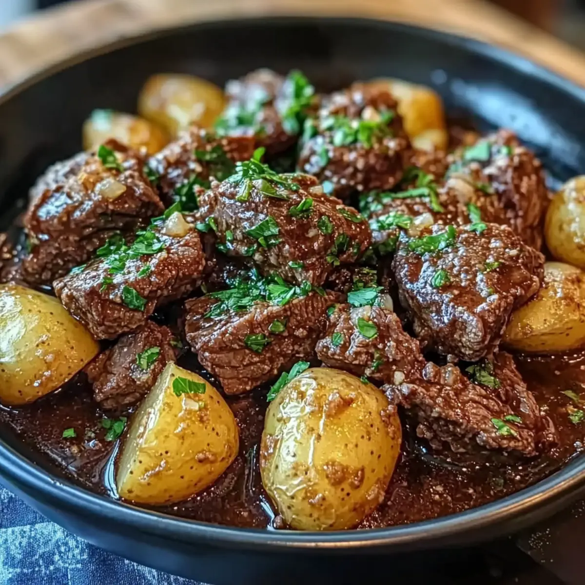 - After cooking, transfer the beef and potatoes to a serving platter, spoon the sauce over the top, and garnish with freshly chopped parsley.