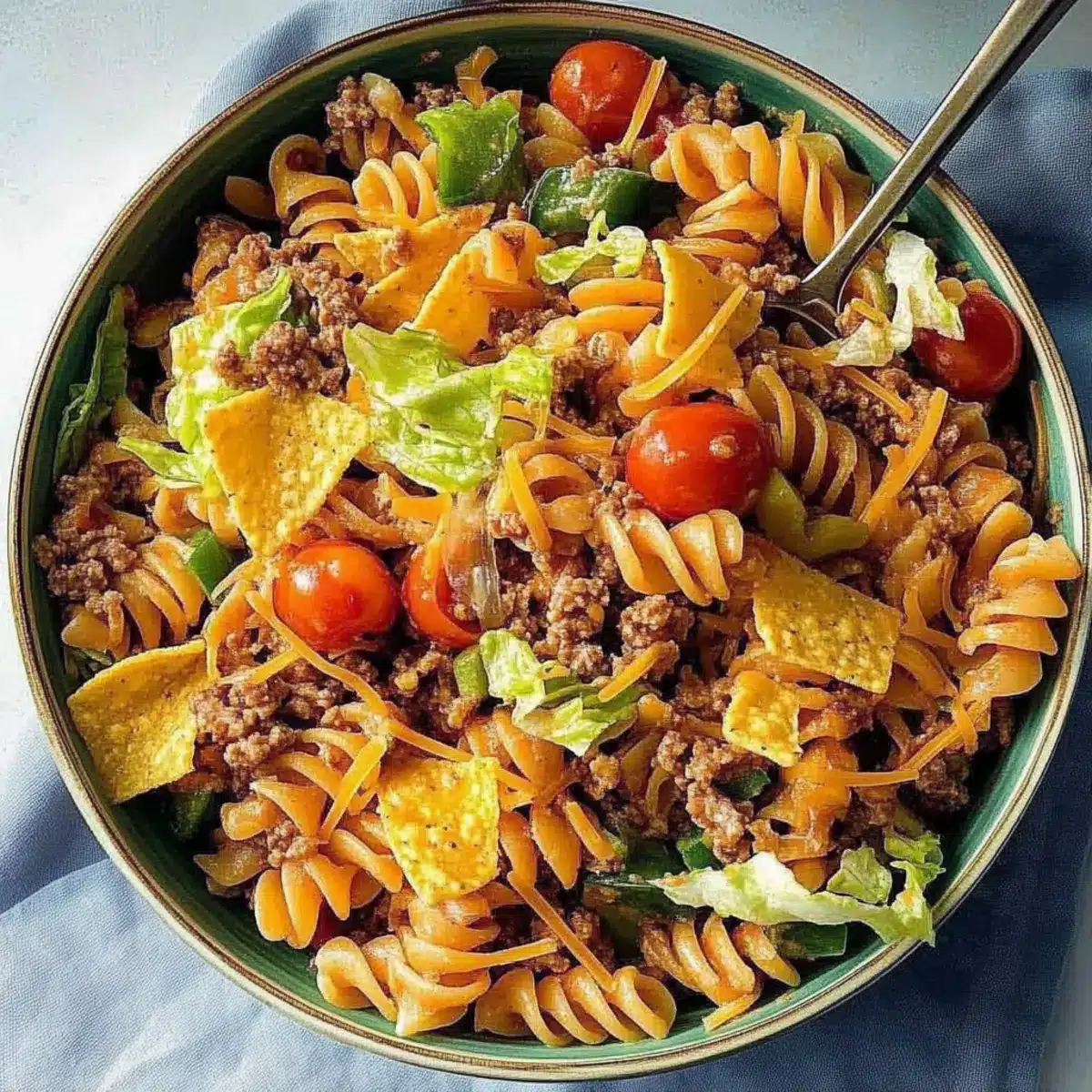 This refreshing Taco Pasta Salad can be enjoyed immediately or chilled in the refrigerator for up to four days. If serving later, consider keeping tortilla chips on the side to maintain their crunch. Scoop the salad into bowls and top with the crispy chips just before serving, allowing everyone to enjoy that satisfying texture.
