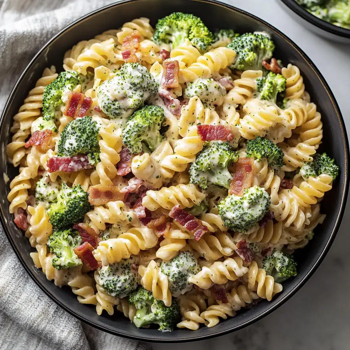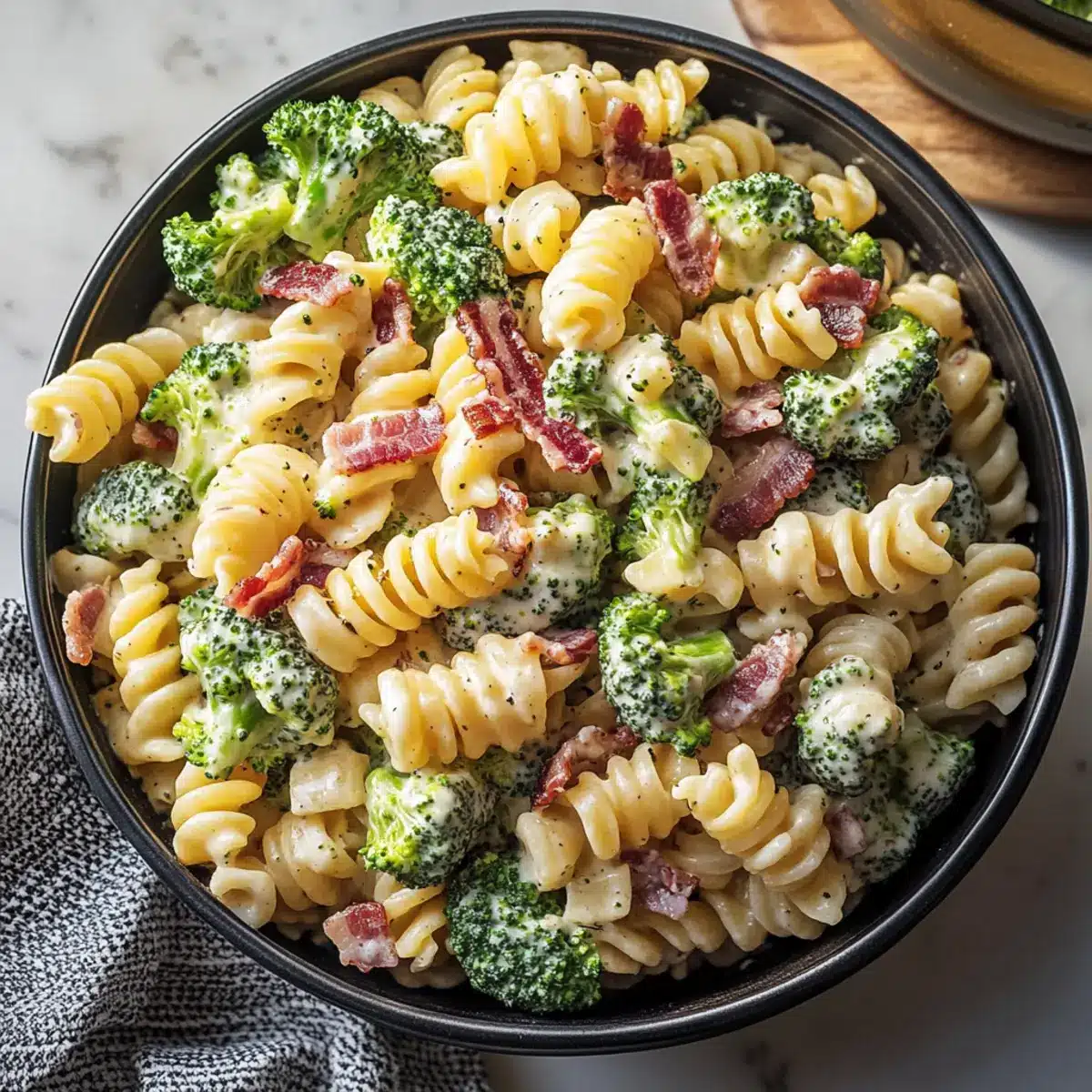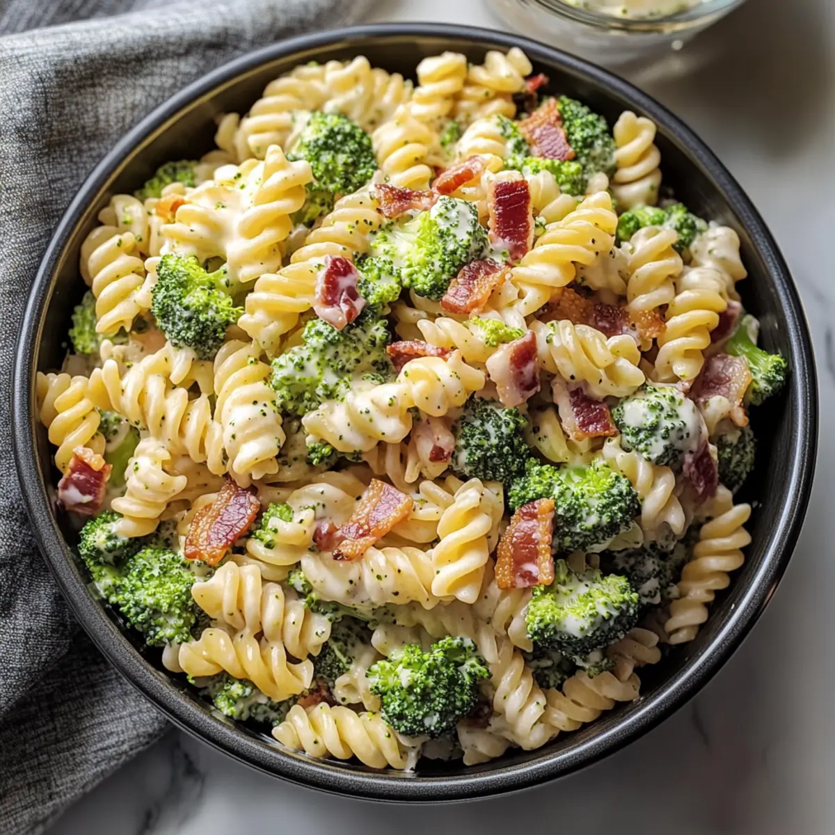 Just before serving, sprinkle crumbled bacon on top of the salad and give it a gentle mix to incorporate the crispy bits throughout. This final touch adds delightful texture and flavor, making your Tasty Broccoli Pasta Salad a hit at any gathering.