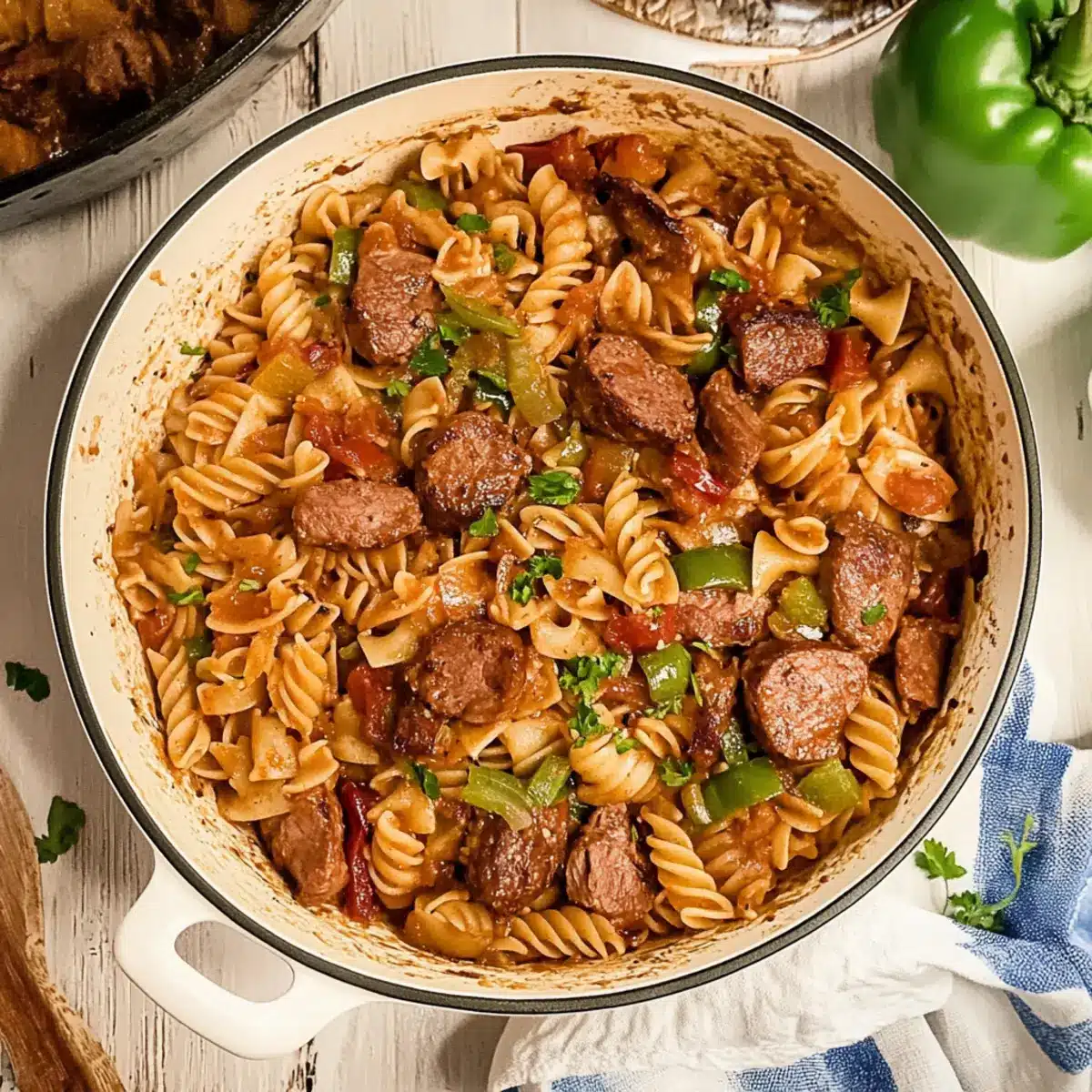 Now, add the cubed pork steak and sliced smoked sausage to the pot. Cook for 20–25 minutes, stirring occasionally until the sausage caramelizes and the meat is browned. This step not only adds depth to the flavors but also brings a comforting heartiness to your Velvety Pastalaya.